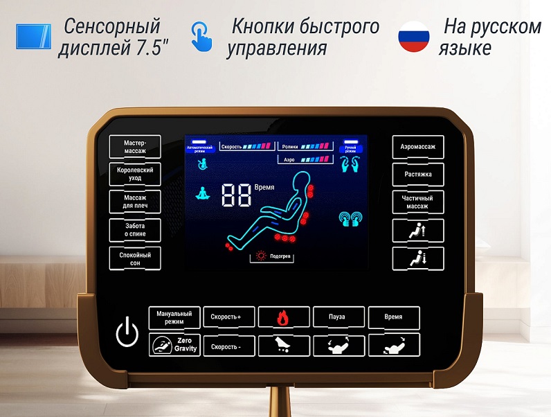- Управляйте с легкостью! Интуитивно понятный LED дисплей позволяет легко управлять всеми функциями кресла. Вы сможете быстро выбрать нужную программу, регулировать интенсивность массажа и следить за временем сеанса. Яркие и четкие индикаторы делают использование кресла простым и удобным для любого пользователя. С помощью встроенного LED дисплея вы сможете также настроить положение спинки, отрегулировать подъем голеней, а также отрегулировать угол наклона кресла в режиме Zero Gravity, который помогает дополнительно снять усталость с мышц и улучшить кровообращение за счет имитации состояния невесомости. Функция памяти для двух пользователей положения массажера для плеч, интенсивности массажа, положение массажера для икроножных мышц и прочие данные о режиме массажа. При необходимости в меню можно настроить подогрев, роликовые массажеры, яркость экрана, время, язык и отображение состояния. Широкий диапазон изменения уровня давления и времени поможет настроить массажный механизм под свои потребности